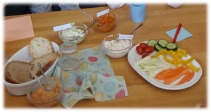 Im Rahmen eines gemeinsamen Nachmittagssnacks erklärte eine Referentin der Landesinitiative BeKi den Fachkräften, Kita-Eltern und Kindern worauf es bei der bewussten Kinderernährung ankommt.